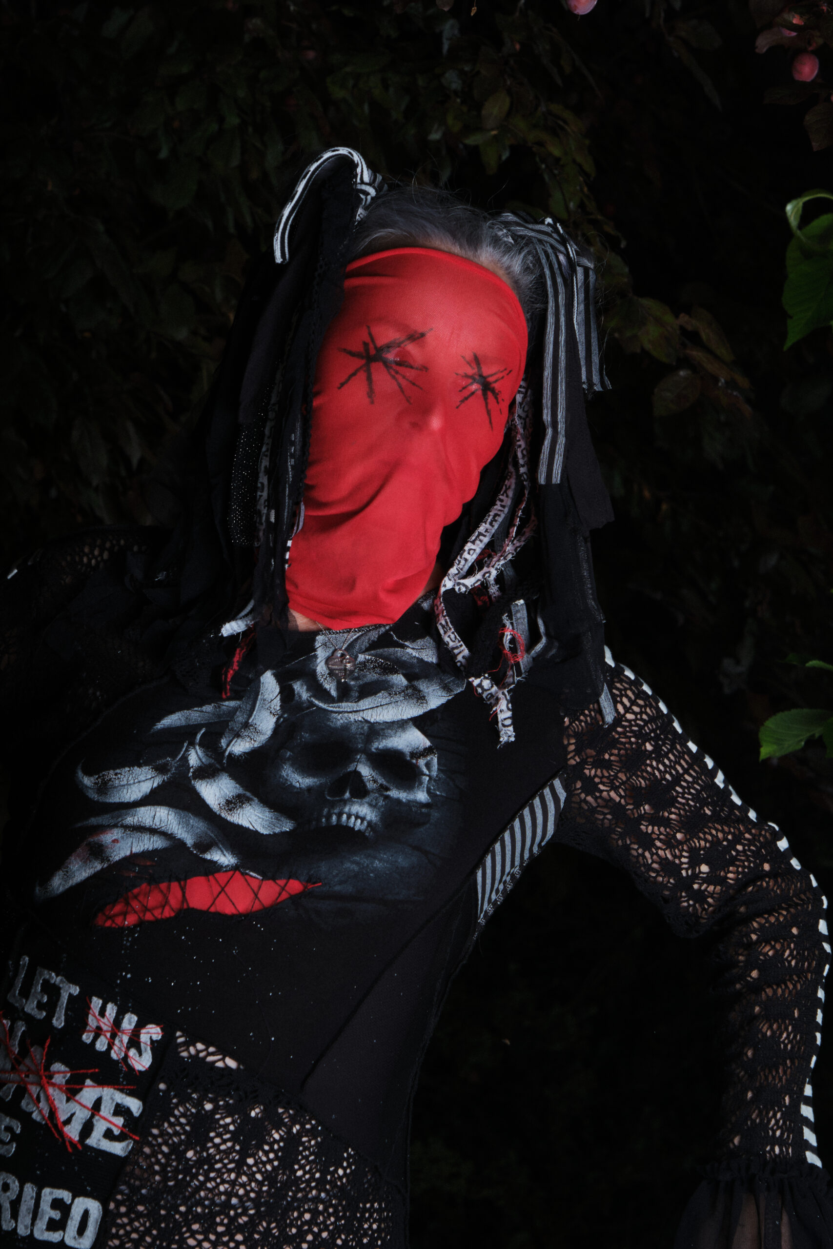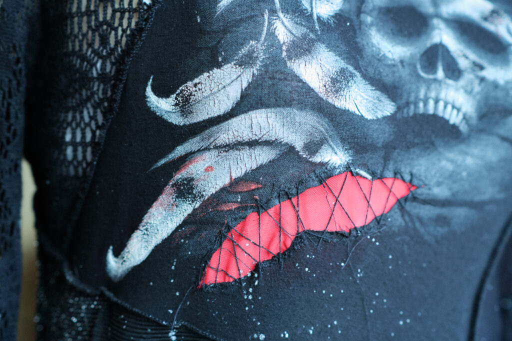 I work with typography a lot in my day-to-day life – designing book covers and laying out interior pages – so it felt completely natural to let text take centre stage here too. There’s something deeply satisfying about cutting letters by hand, especially when they’re imperfect, uneven, and slightly unsettling. My scissors moved carefully through reclaimed white t-shirt cotton, shaping bone-like letters from something soft, familiar and ordinary. That choice of material felt important. A fabric once worn close to someone’s skin now transformed into a message carved into cloth. There’s intimacy in that. And defiance.