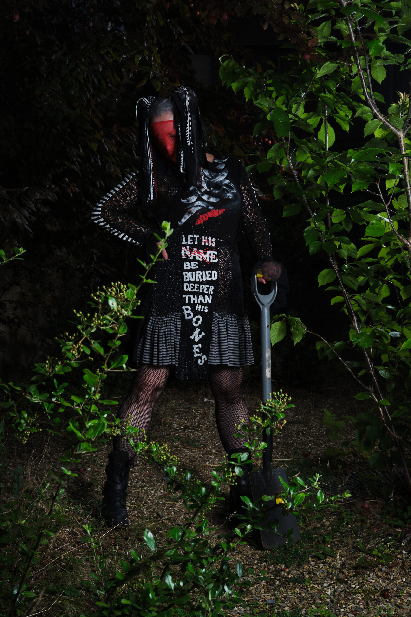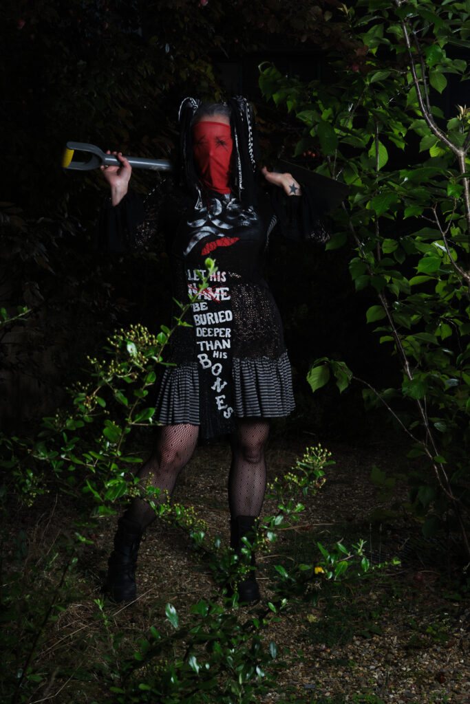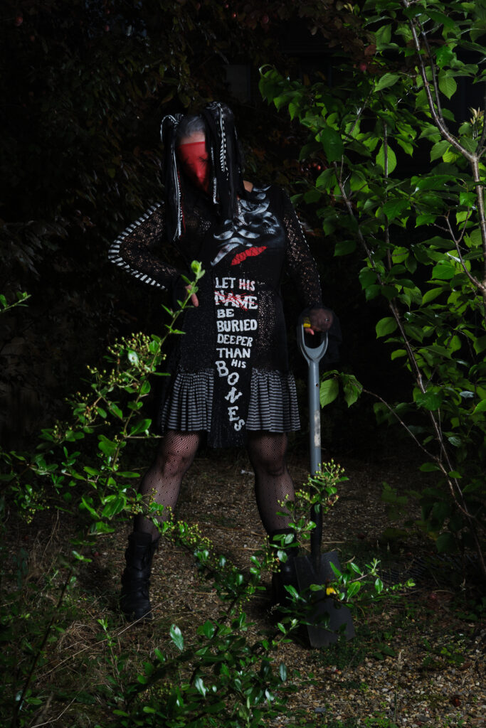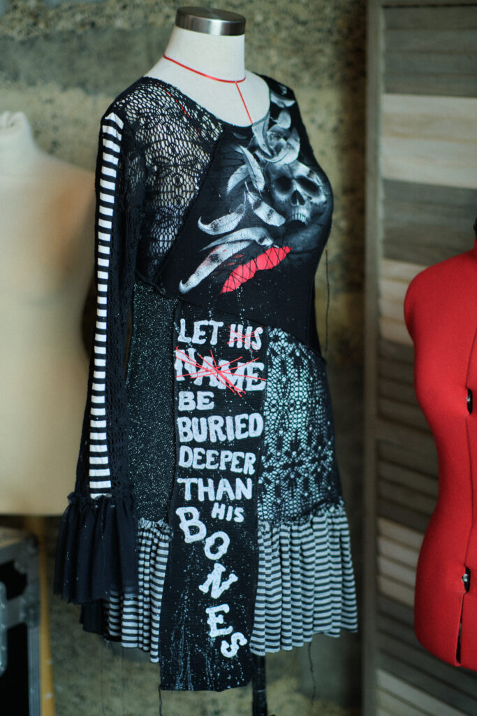 The front offset panel of the dress became the perfect resting place for the words. It sits like a tombstone between two opposing worlds: a glittering, almost celebratory panel on one side, and black lace on the other which I can only really describe as gothic gates of hell. That contrast felt honest. Trauma rarely exists in isolation. It sits alongside normality, sparkle, laughter, productivity. We learn how to carry it while appearing functional, even joyful. This dress needed to hold both truths at once.