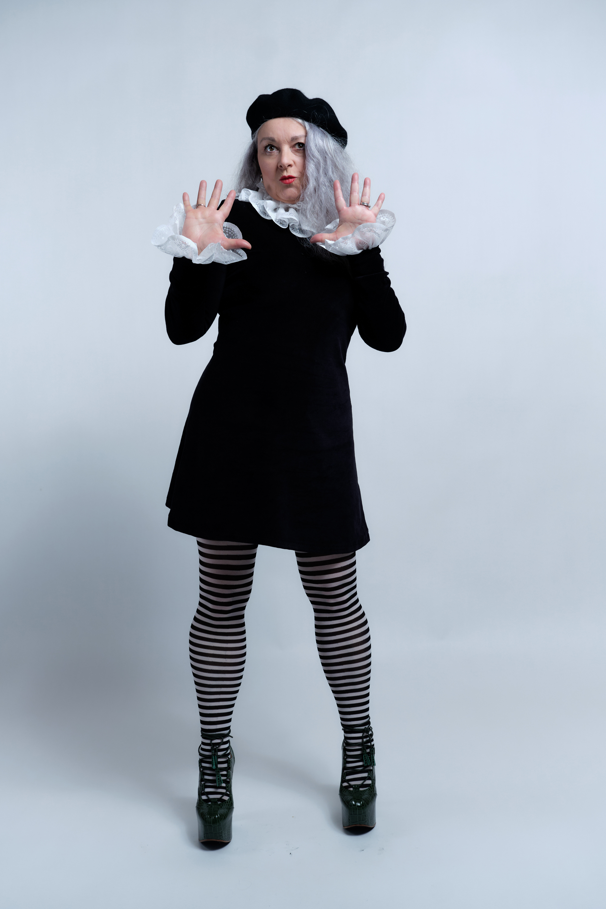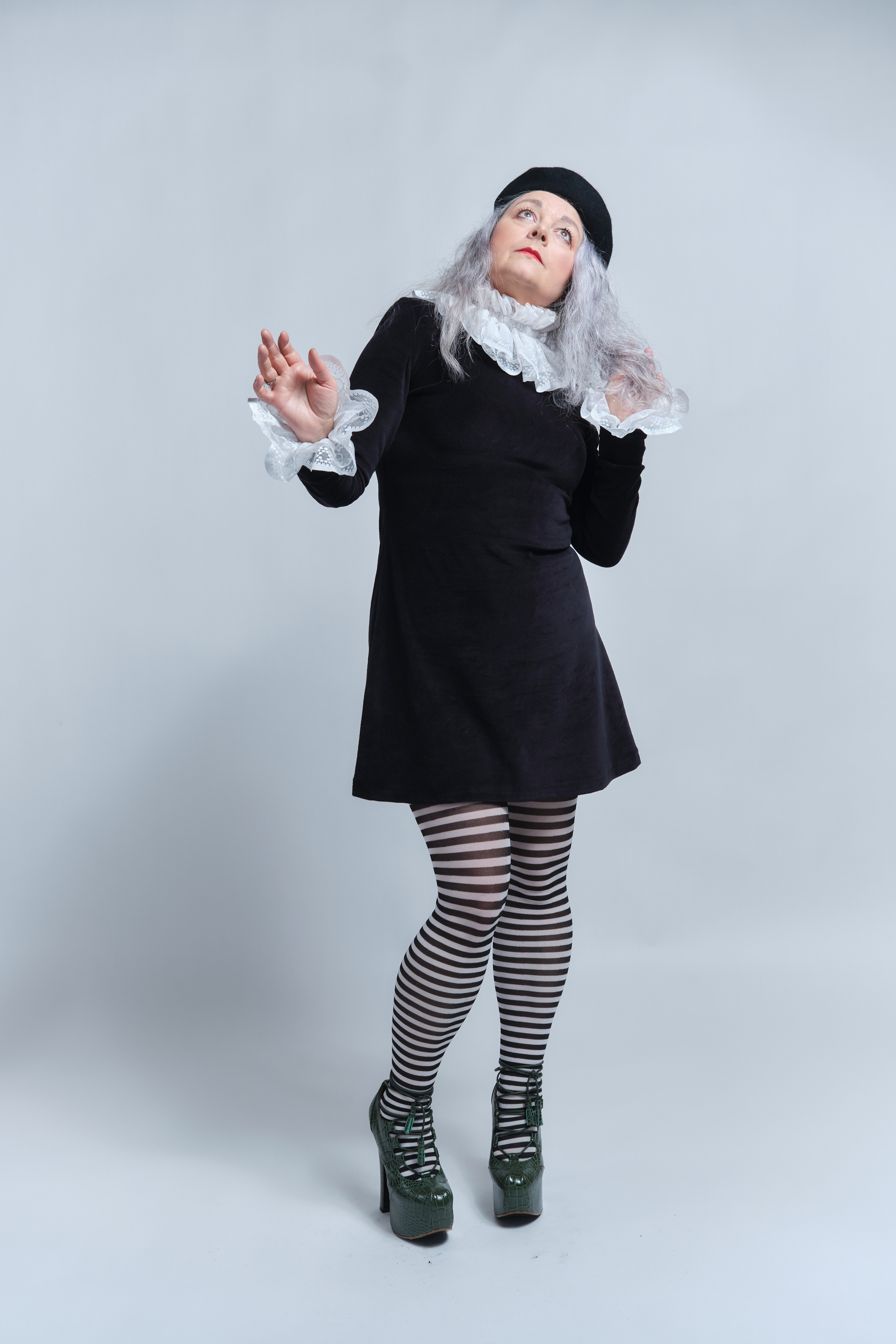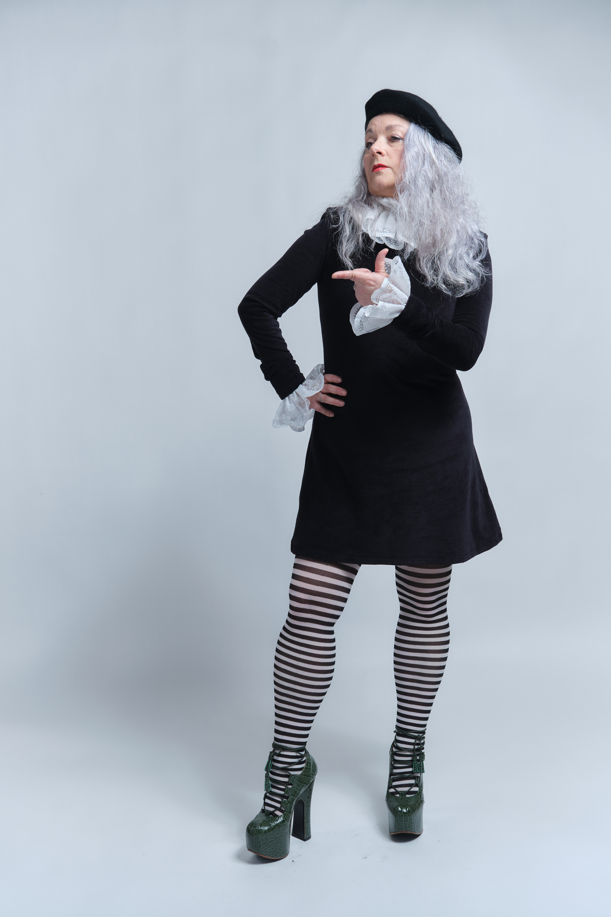Quite what the occasion is for this particular look, I’m not entirely certain. Somewhere between a Marcel Marceau homage and a Wednesday Addams wannabe party. It’s dramatic, slightly ridiculous, but deeply satisfying. Sorry Claudia. I tried! The beauty of a very plain base dress is that it becomes a blank canvas for this sort of nonsense, and I love garments that can shapeshift like that.